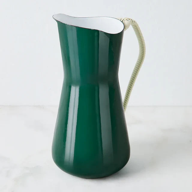 This iconic pitcher was designed by Jens Quistgaard in 1956 and last produced in 1967. The current design remains faithful to the classic original, but with a slightly larger body. From its elegant silhouette and signature black rim to its hand-woven rattan-style handle, this enameled carbon steel collectible embodies form and function, exuding mid-century charm whether used for drinks, flowers, or displayed anywhere.