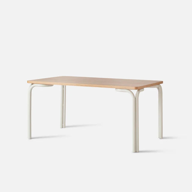 Inspired by Bauhaus design and industrial-style furniture, this dining table is sure to be a focal point in any dining room. Its steel legs and wooden top lend it a playful touch.
